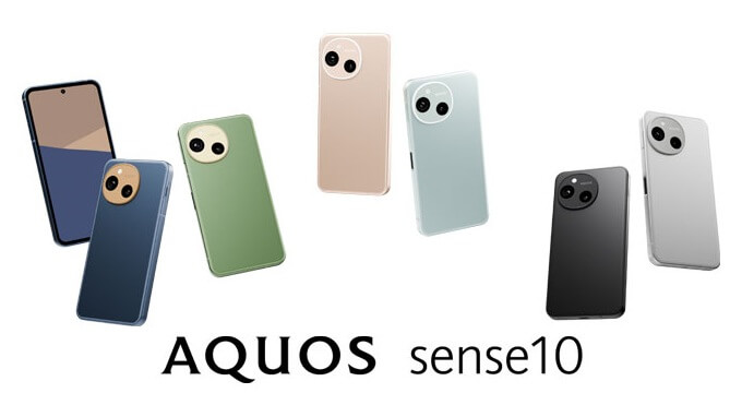 AQUOS sense10 (アクオス センステン) は、5,030万画素デュアルカメラと3,200万画素インカメラ、240Hz駆動に対応した6.1インチのPro IGZO OLEDディスプレイ、ステレオスピーカー、Snapdragon 7s Gen 3、6GB/8GBメモリー、128GB/256GBストレージ、5,000mAhバッテリーを搭載するほか、防水防塵、MIL規格、おサイフケータイ (FeliCa) などに対応。