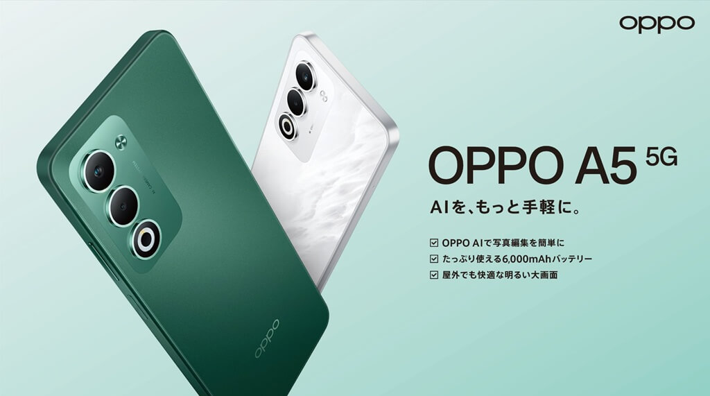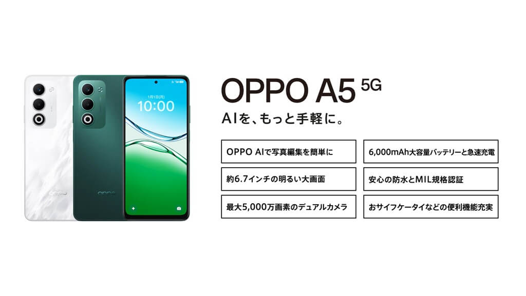 オウガジャパンは、5G対応のAndroidスマートフォン「OPPO A5 5G」を発表しました。5,000万画素デュアルカメラや120Hz駆動の大画面ディスプレイ、6,000mAhバッテリーを搭載するほか、防水防塵、MIL規格、おサイフケータイ機能にも対応した高性能エントリーモデル。2025年12月4日 (木) に発売し、公式オンラインストアの販売価格は3万2,800円 (税込) になっています。