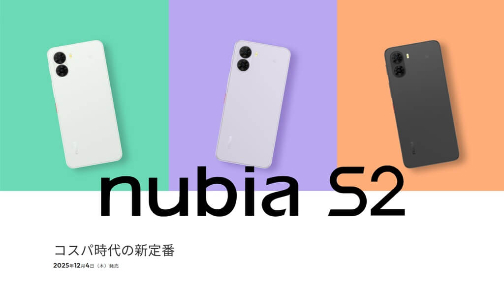 ZTEジャパンは5G対応Androidスマートフォン「nubia S2」を発表しました。5,000万画素デュアルカメラや120Hz駆動の大画面ディスプレイ、5100mAhバッテリーを搭載するほか、防水防塵、MIL規格の耐久性を備え、おサイフケータイ機能も利用可能なエントリーモデル。2025年12月4日 (木) にワイモバイルで発売し、公式オンラインストアの販売価格は2万1,888円 (税込) となっています。
