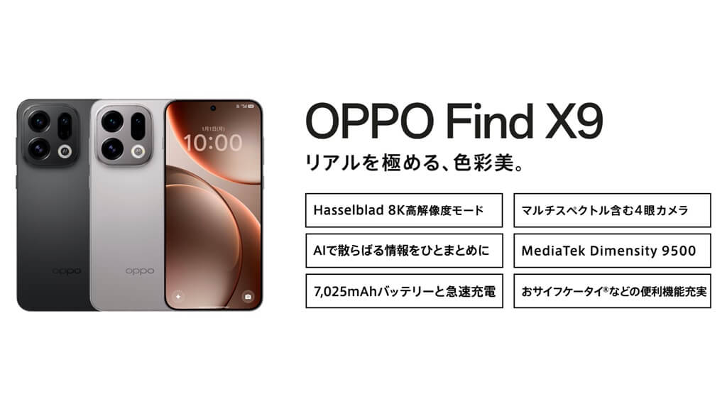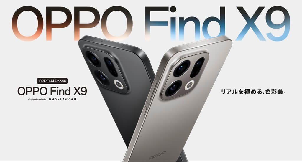 2025年12月23日 (火) 10時 に「OPPO Find X9」を発売し、端末価格は14万9,800円 (税込) ですが、他社から乗り換え (MNP) で音声通話SIM/eSIMとセットで申し込むと10万9,800円 (税込) で購入できます。