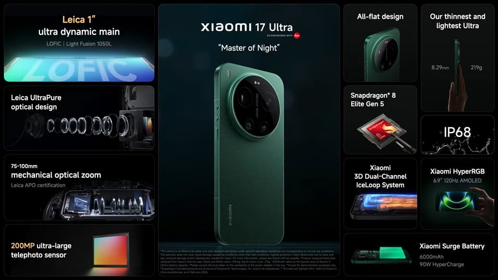 Xiaomi 17 Ultra (シャオミ セブンティーン ウルトラ) は、Leica共同開発カメラを搭載したフラッグシップスマートフォン「Xiaomi 17」シリーズの最上位モデル。