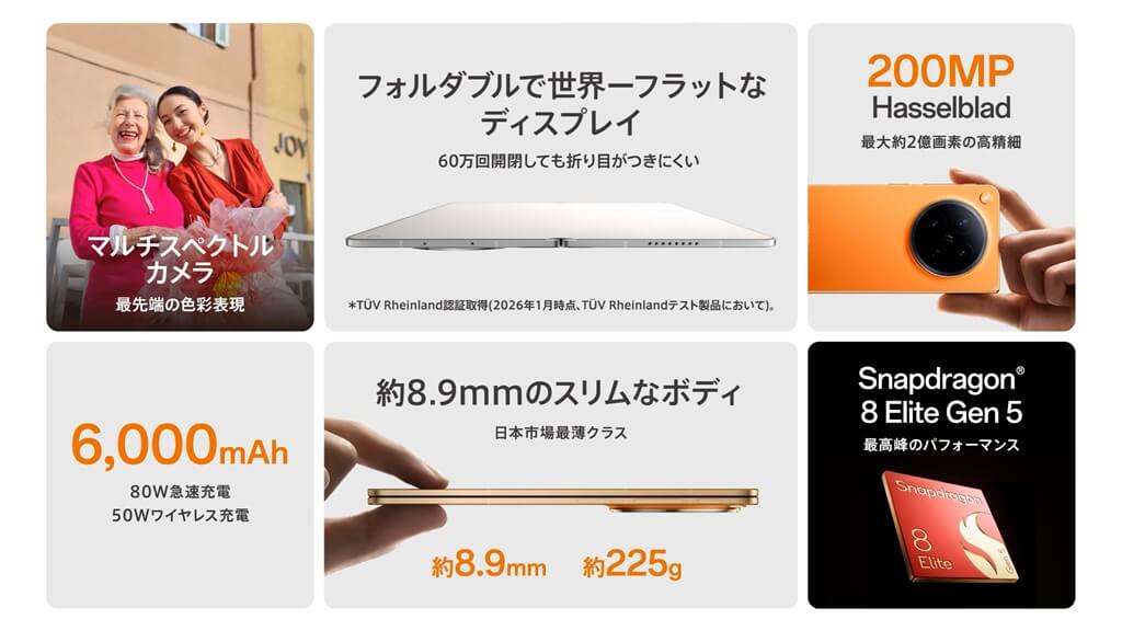 オウガジャパンは5G対応フォルダブルスマートフォン「OPPO Find N6」を発表しました。2億画素のHasselbladクアッドカメラや、ほぼ折り目無しのインナーディスプレイ、Snapdragon 8 Elite Gen 5、50Wワイヤレス充電対応の6000mAhバッテリーを搭載したハイエンドモデル。2026年4月15日 (水) に発売し、販売価格は31万8,000円 (税込) になっています。